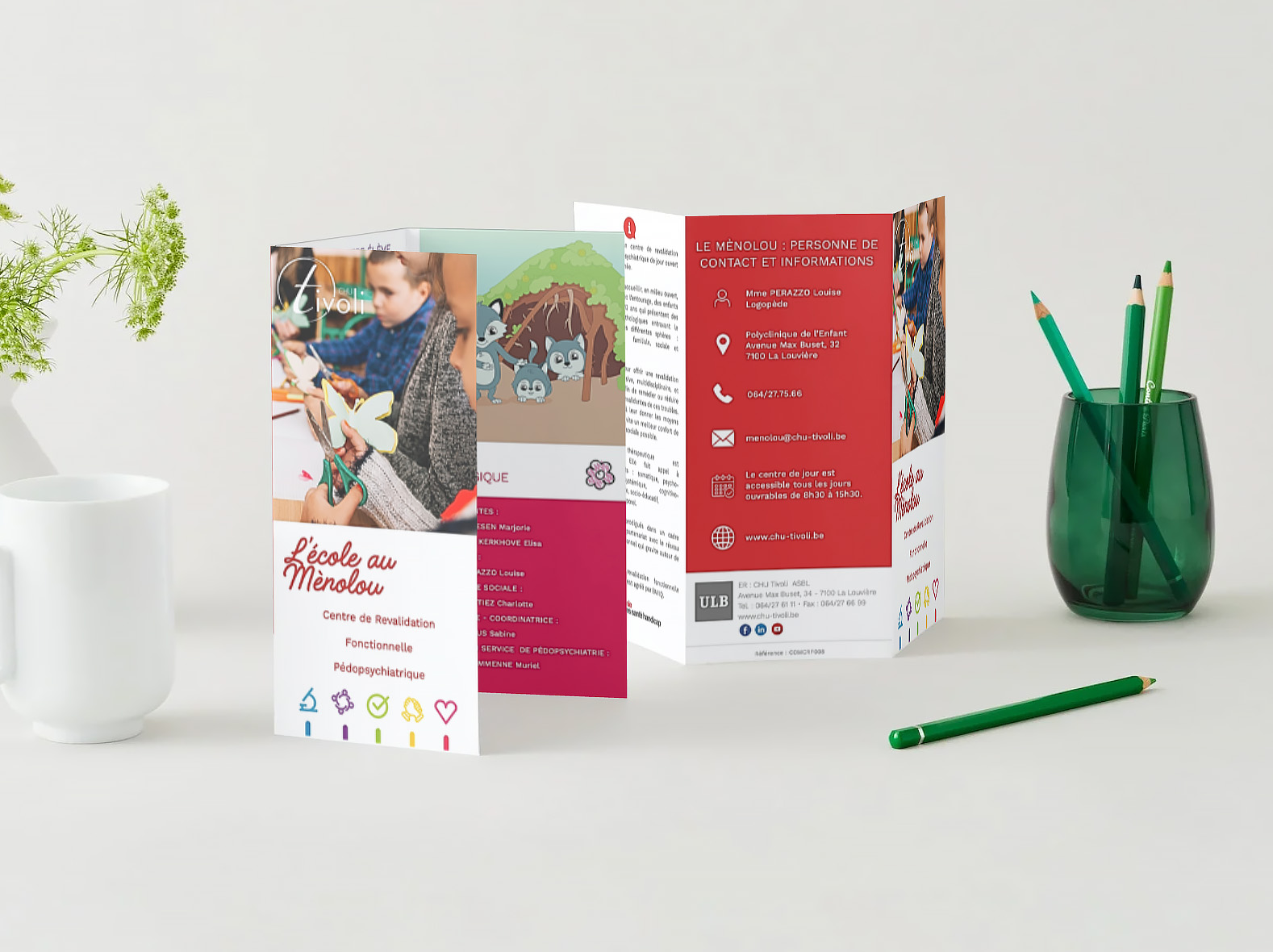 Au cours de mon stage au CHU Tivoli, j’ai conçu de nombreux supports de communication (affiches, brochures, flyers, invitations, vidéos, triptyques…), en veillant à respecter la charte graphique et les besoins spécifiques de chaque service.